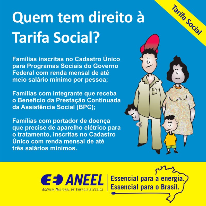 A tarifa social de energia é uma assistência governamental destinada às famílias com renda muito baixa, que podem ter dificuldade para arcar com a conta de energia.