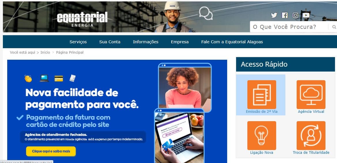 Para garantir mais praticidade para os seus clientes, a Equatorial Energia Alagoas também disponibiliza alguns serviços no site. Por ele você tem acesso a Agência Virtual, na qual você pode verificar histórico de faturas, cadastrar e-mail para recebimento da fatura digital, consultar locais de atendimento e muito mais.